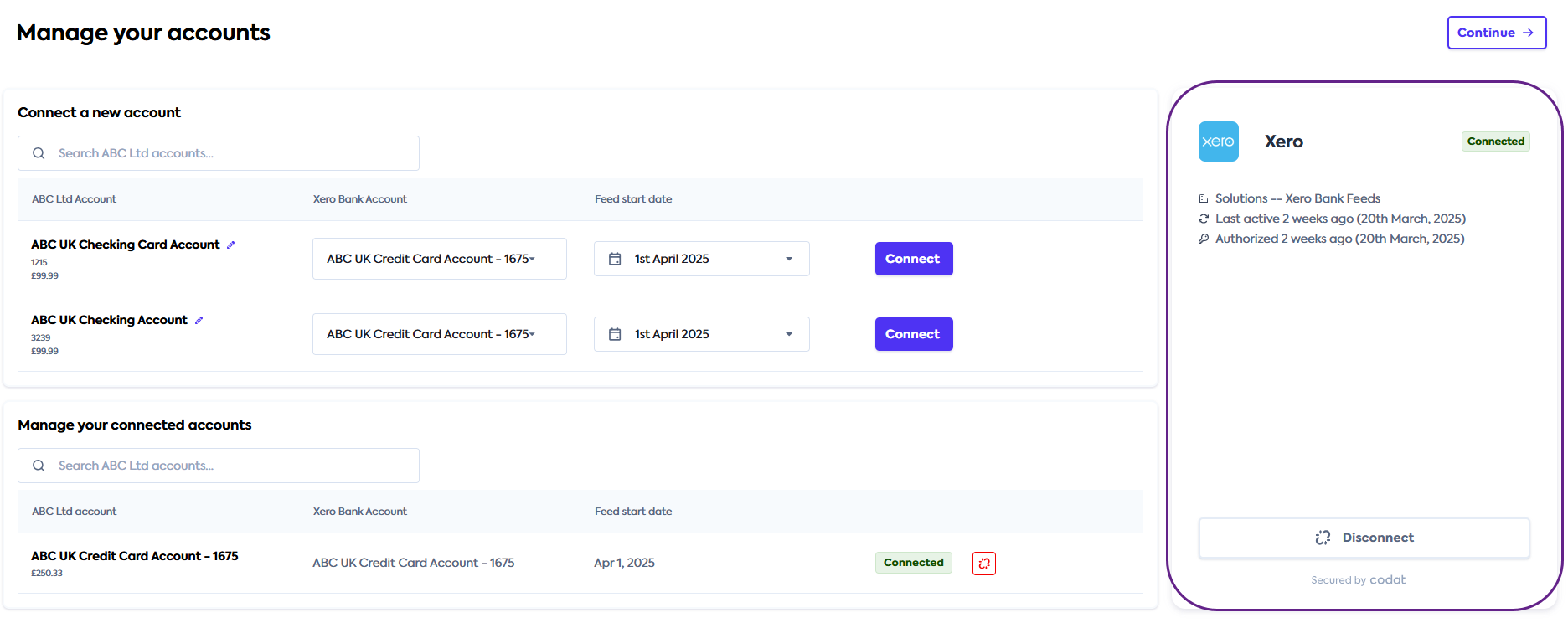 We have enhanced the account mapping user interface (UI) of our Bank FeedsBank Feeds A Codat product that enables automatic synchronization of bank transaction data into a company's accounting software. solution with a connectionConnection A link between a Codat company and a data source (like an accounting platform). Each connection represents authorized access to pull or push data from that platform. management component and an updated page header.